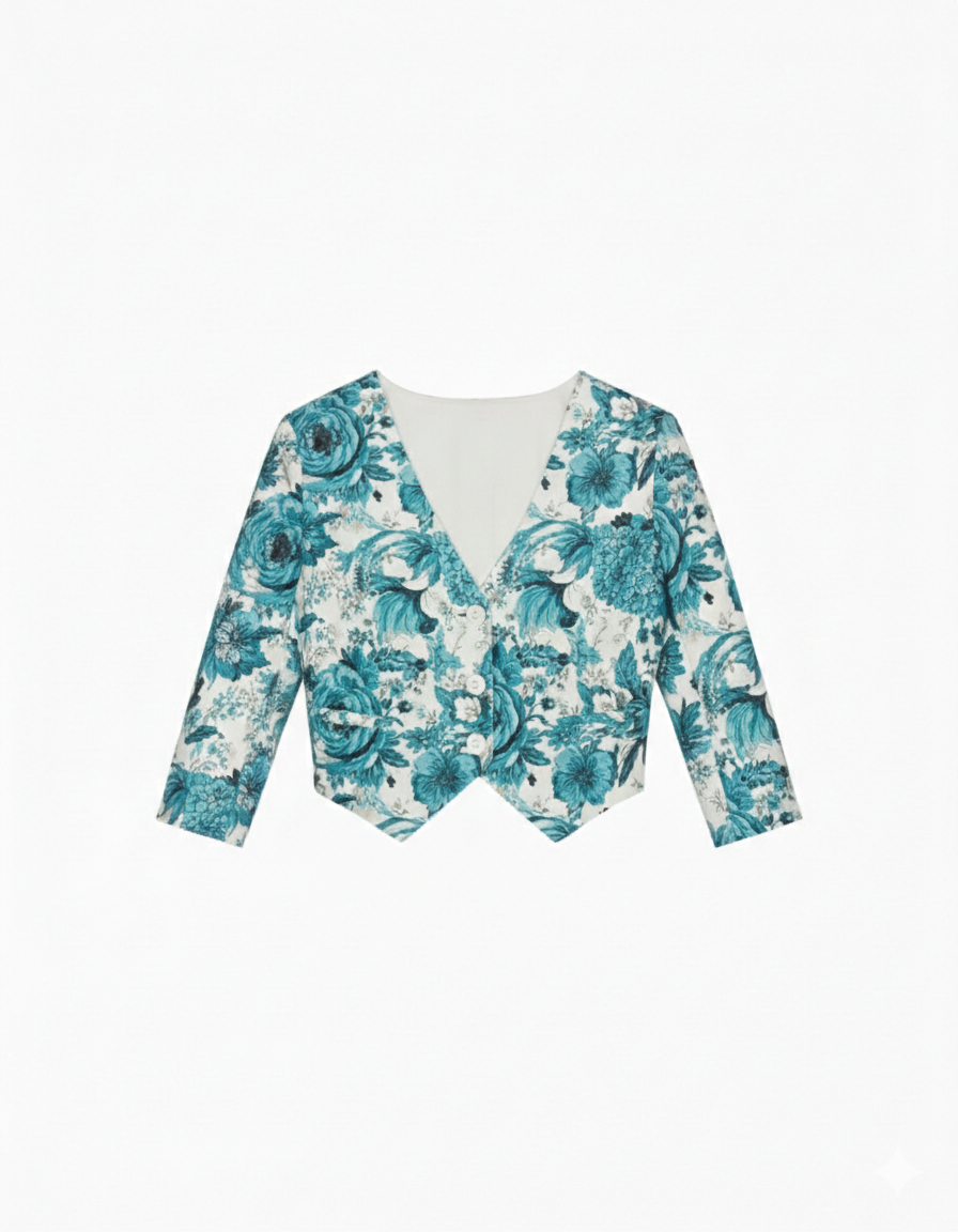 A silk waistcoat top blooming with quiet florals, paired with a fluid silk skirt that moves like wind across open fields. Graceful, grounded, and poetic—crafted for moments that feel both free and deeply feminine.