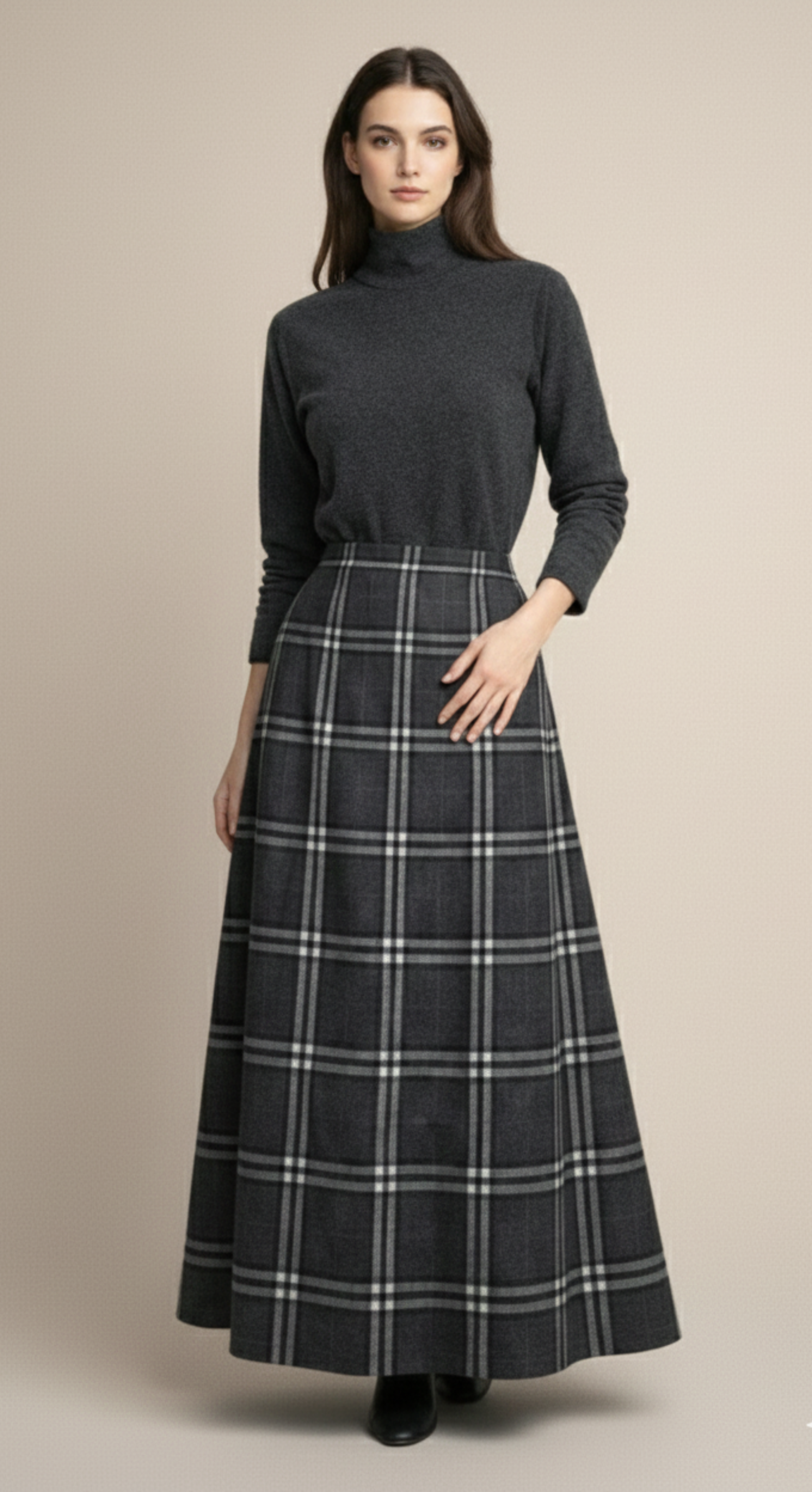 A refined high-neck top balanced with a flowing plaid skirt for modern sophistication.