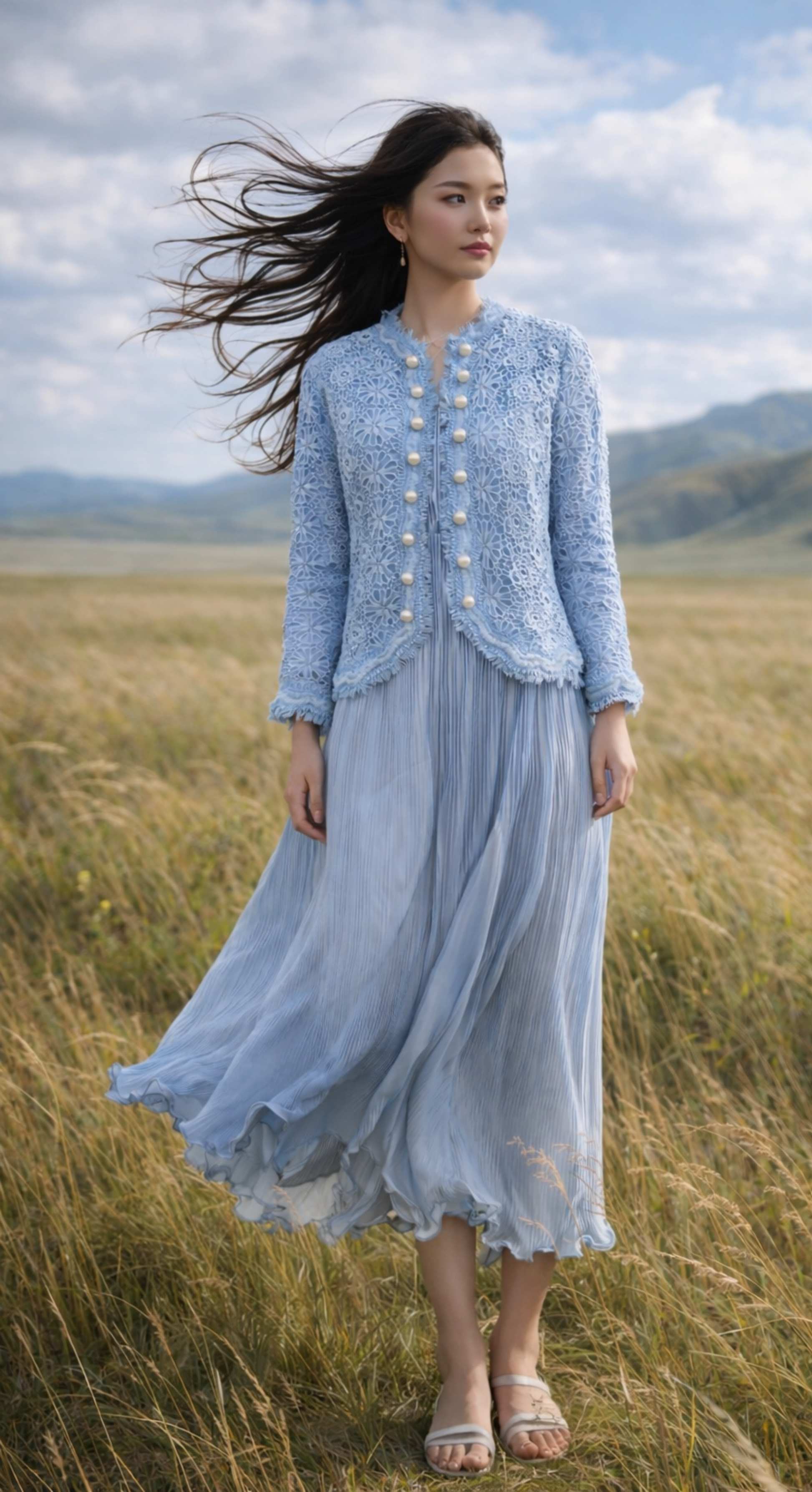 Paired with a flowing dress of soft crushed silk, it moves effortlessly, capturing lightness, grace, and quiet luxury.