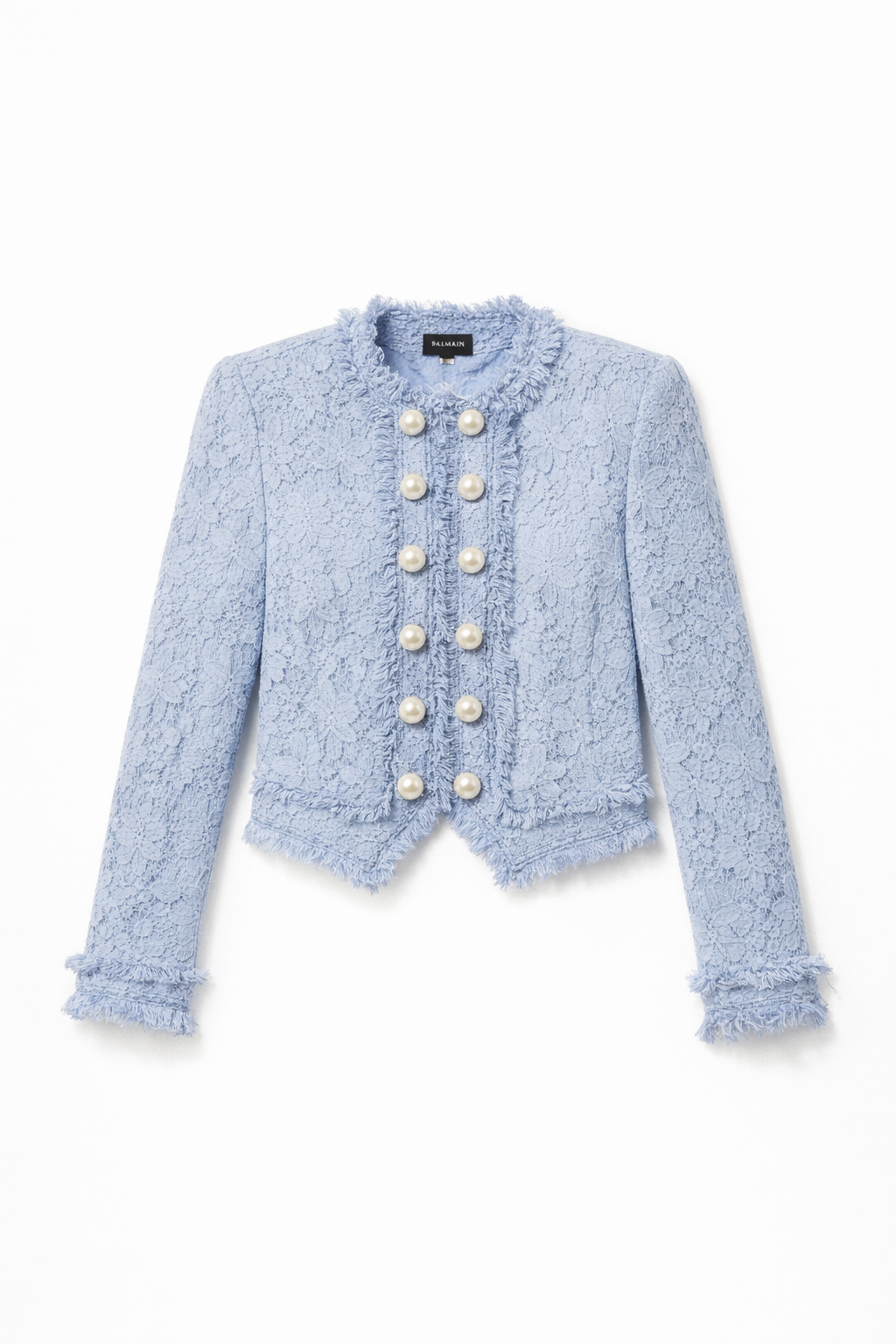 An intricate lace jacket adorned with luminous pearl buttons and delicate lace detailing, blending vintage romance with refined craftsmanship.