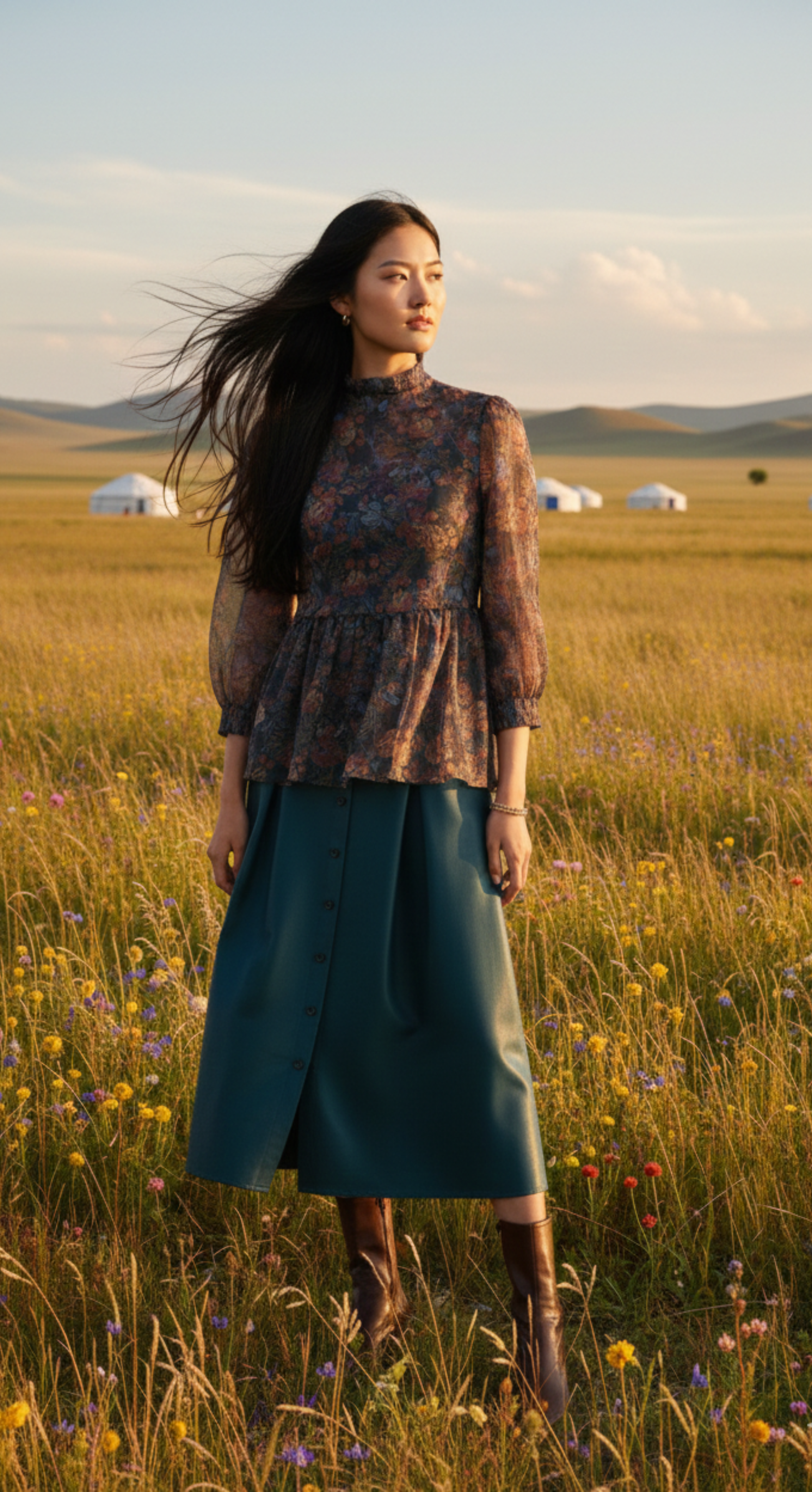 Paired with a fluid skirt of the softest silk, the look moves like wind across open grasslands—effortless, poised, and timeless.